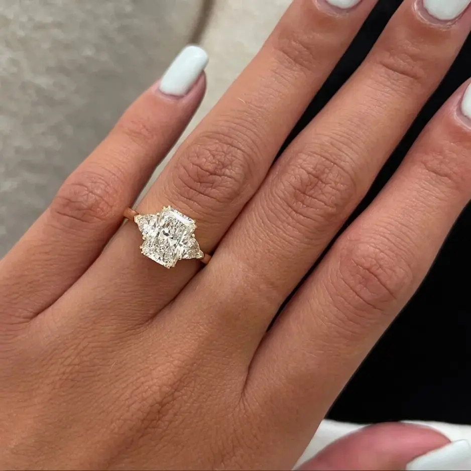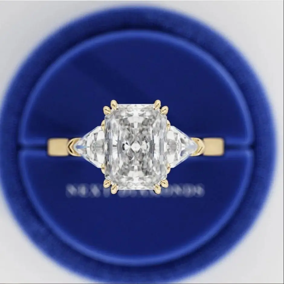 Anillo de diamante cultivado en laboratorio radiante de 2 quilates Anillo de diamante con 3 gabillones de piedra Trilogía CVD HPHT VS-VVS Anillos de oro amarillo de 14 k con IGI