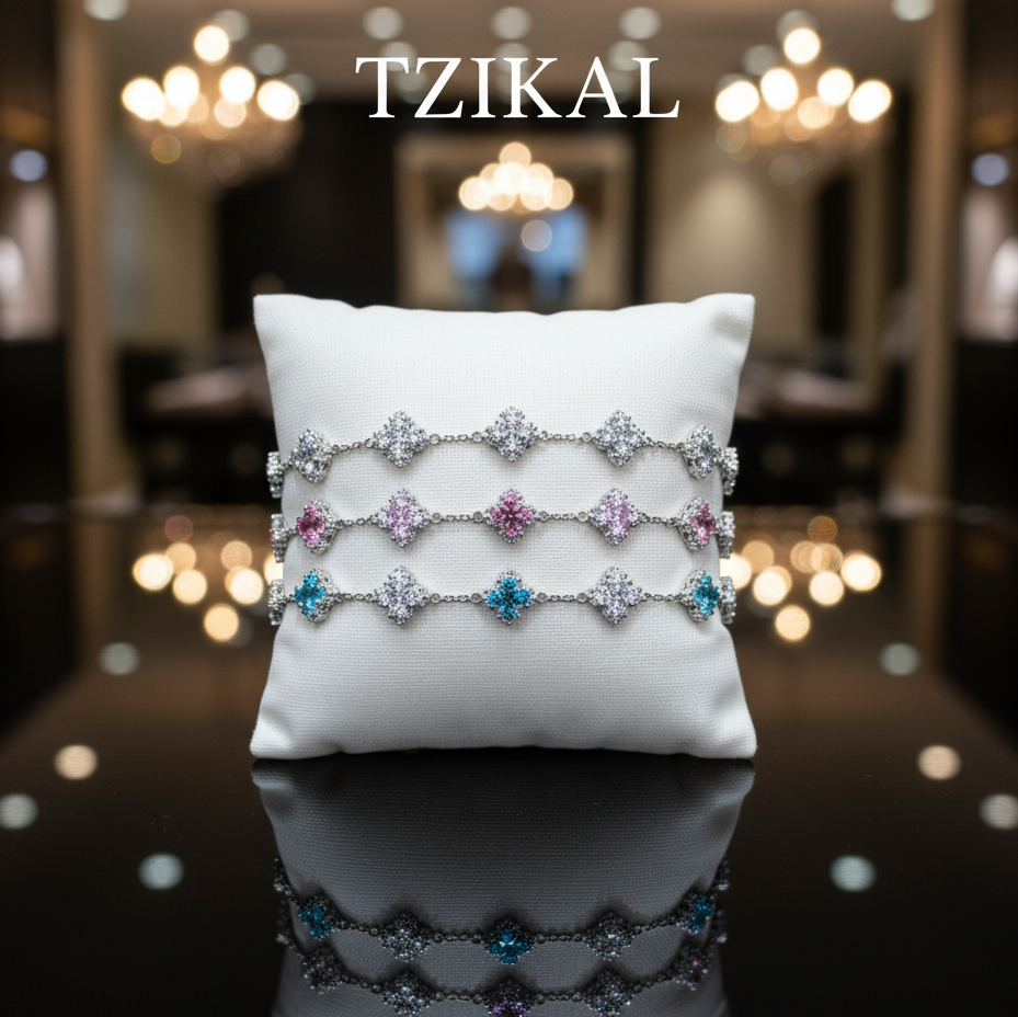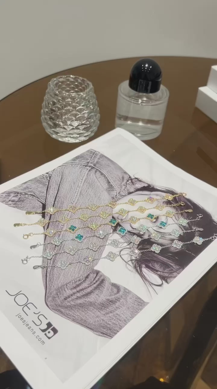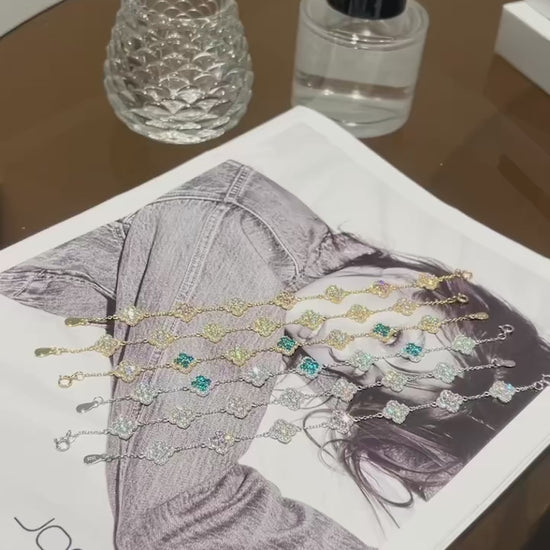 Esta pulsera con diseño de trébol está adornada con moissanita, ofreciendo un brillo excepcional y un toque elegante para complementar tu estilo. Perfecta para quienes buscan un accesorio distintivo y lleno de buena energía.