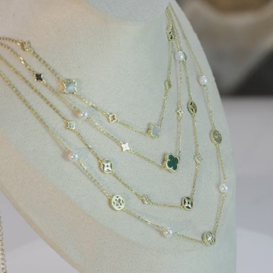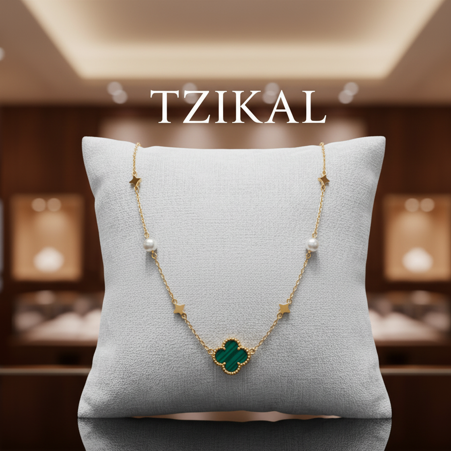 Gargantilla elaborada en plata de ley 925, decorada con una concha de perla y detalles en oro de 14 quilates, realzada con un elegante adorno de malaquita verde en forma de trébol de cuatro hojas. Una pieza única que combina sofisticación y buen gusto para resaltar tu estilo con un toque de armonía y fortuna.